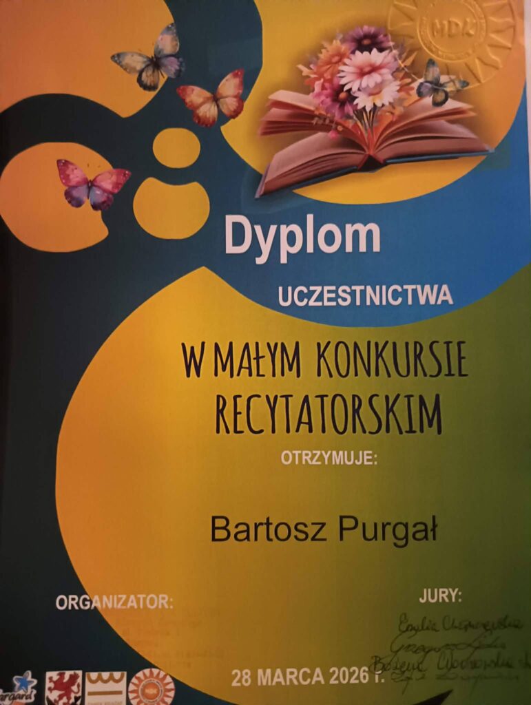 W sobotę 28 marca nasz Uczeń klasy 2 – Bartuś Purgał, reprezentował dzielnie NSP Gogolewo w konkursie recytatorskim organizowanym przez Młodzieży Dom Kultury w Stargardzie!